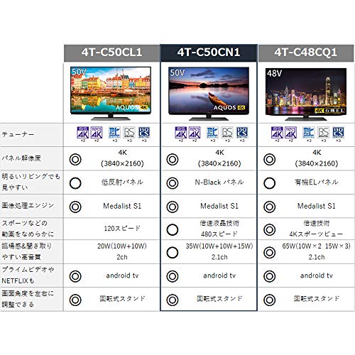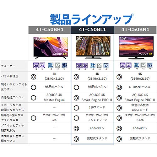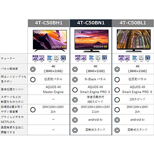 シャープのBN1が、一番コスパが良さそうでしたので購入しました。 最初の画面は、レグザより白っぽく見えますが、映像調整すればさほど違和感ありません。 それよりも、androidTV内蔵なので、今までファイヤースティックTVで見ていたものが ほとんどそのままで、見ることができます。いままで使っていたレグザよりも音もいいし大満足です。 いい買い物をしたと思います。